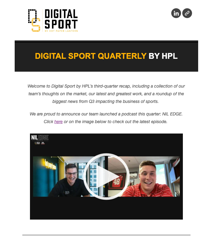 Welcome to Digital Sport by HPL’s third-quarter recap, including a collection of our team’s thoughts on the market, our latest and greatest work, and a roundup of the biggest news from Q3 impacting the business of sports.